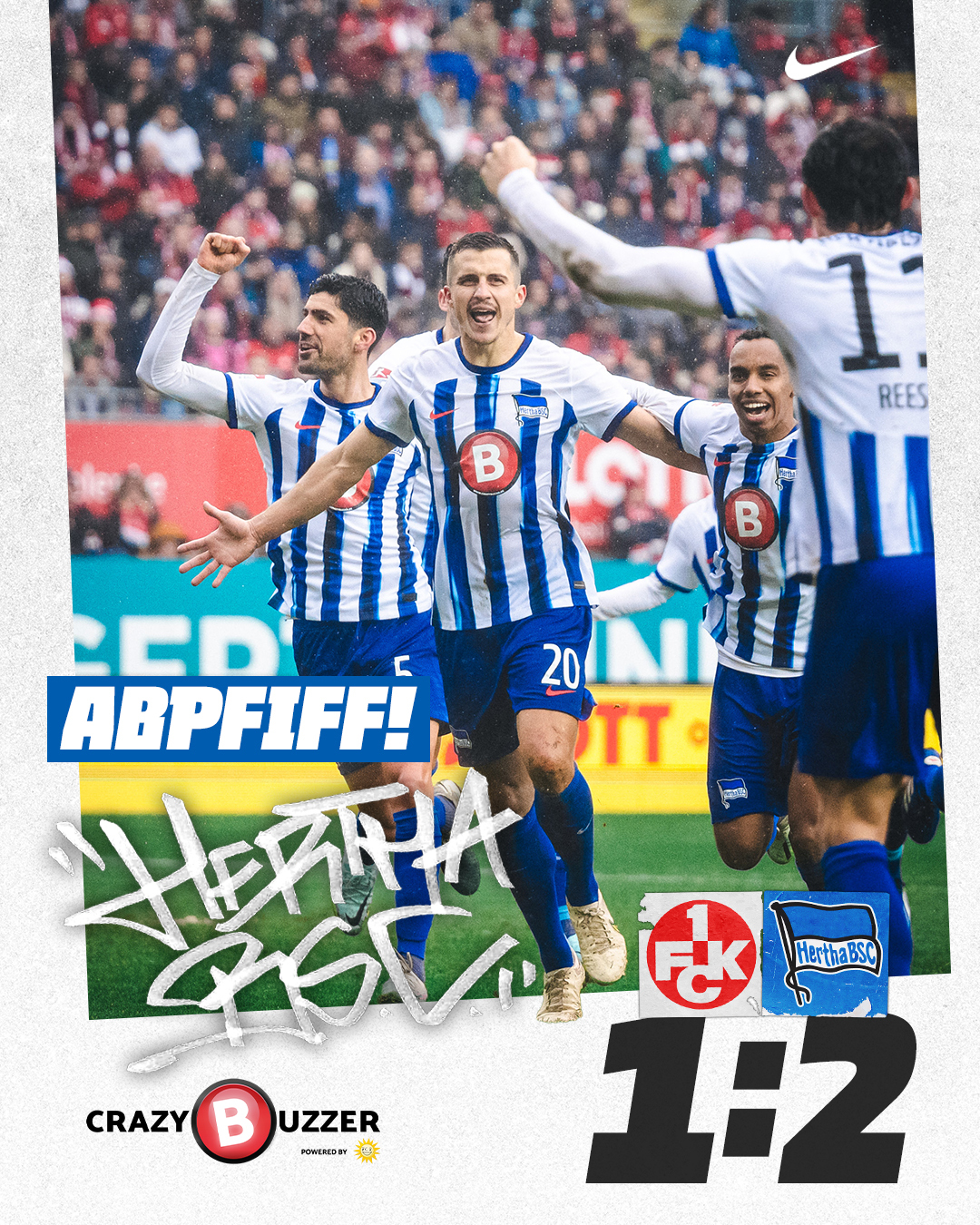 Was für eine Woche! Drei Spiele innerhalb von sieben Tage und drei Siege. Genießt den Moment, Herthanerinnen und Herthaner! Wir verabschieden uns aus Kaiserslautern und sehen uns nächste Woche zu Hause gegen den VfL Osnabrück (16.12.23, 13:00 Uhr) wieder. Lasst das letzte Spiel des Jahres noch einmal alle gemeinsam zelebrieren. Ha Ho He!